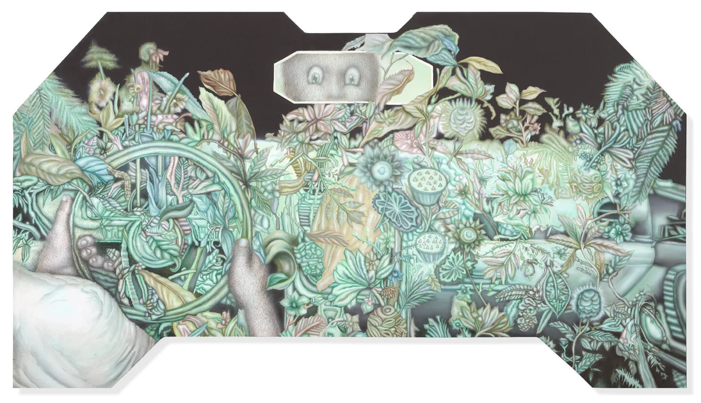 As fascinating the visuals are, the process is just as mind-blowing. To create the brilliant aesthetic underpinning each work, Sandberg employed a broad spectrum of both natural and synthetic materials, along with "recycled computer heat sinks, urethane rubber, cheesecloth, neon light, and sea sponges used in sculpture construction". Each piece was then "bathed in an antiseptic green palette that is common in dental and medical materials. The paintings on wood panels are varnished using a thick high gloss epoxy resin giving a screen like reflection and encasement to those works."