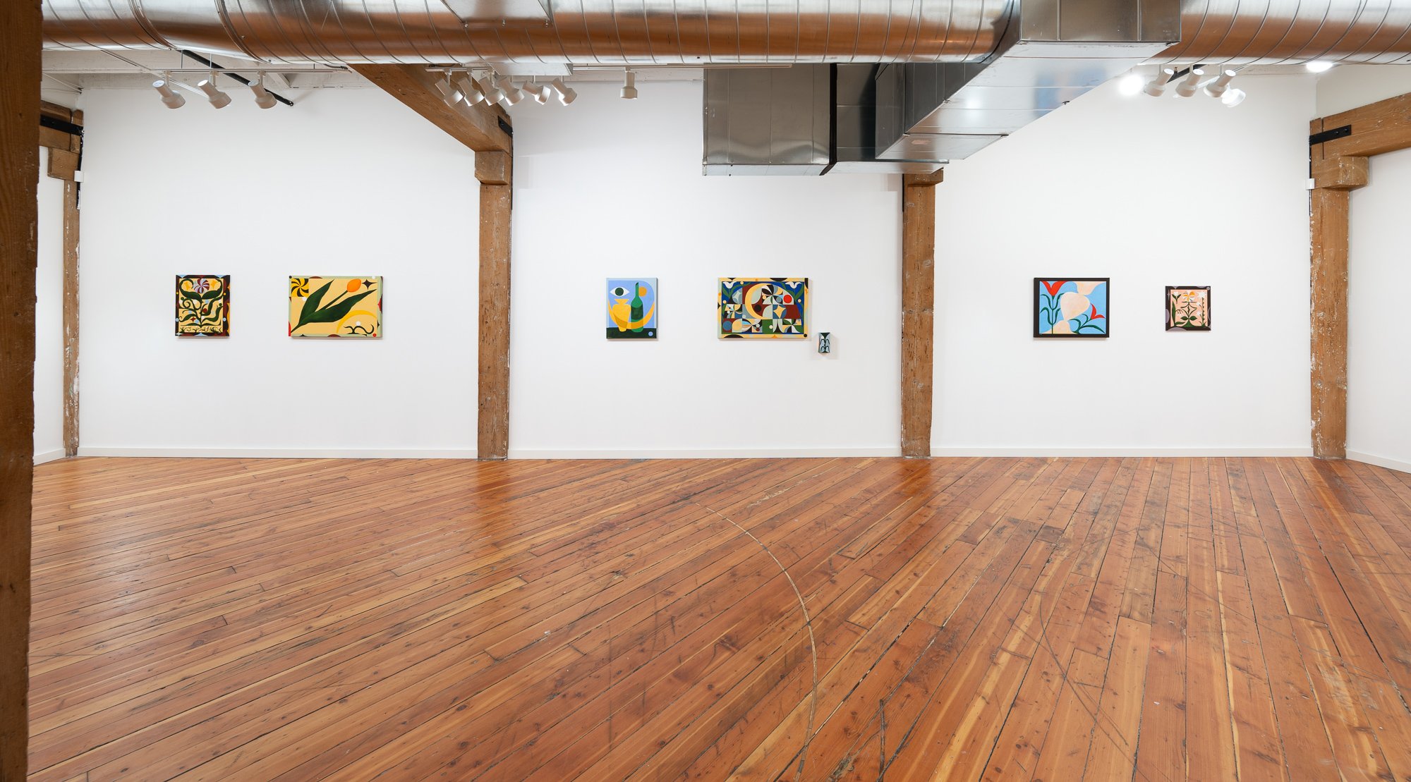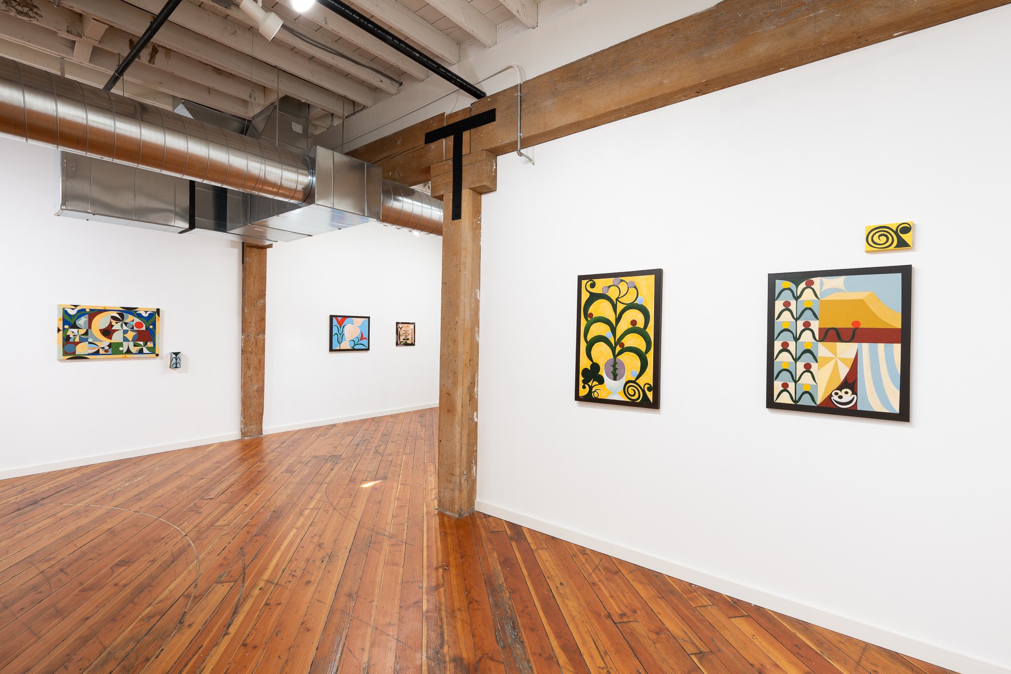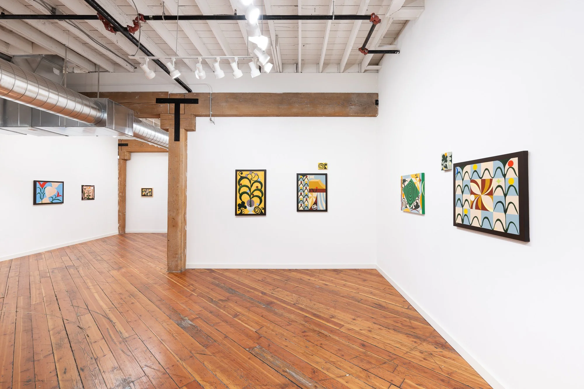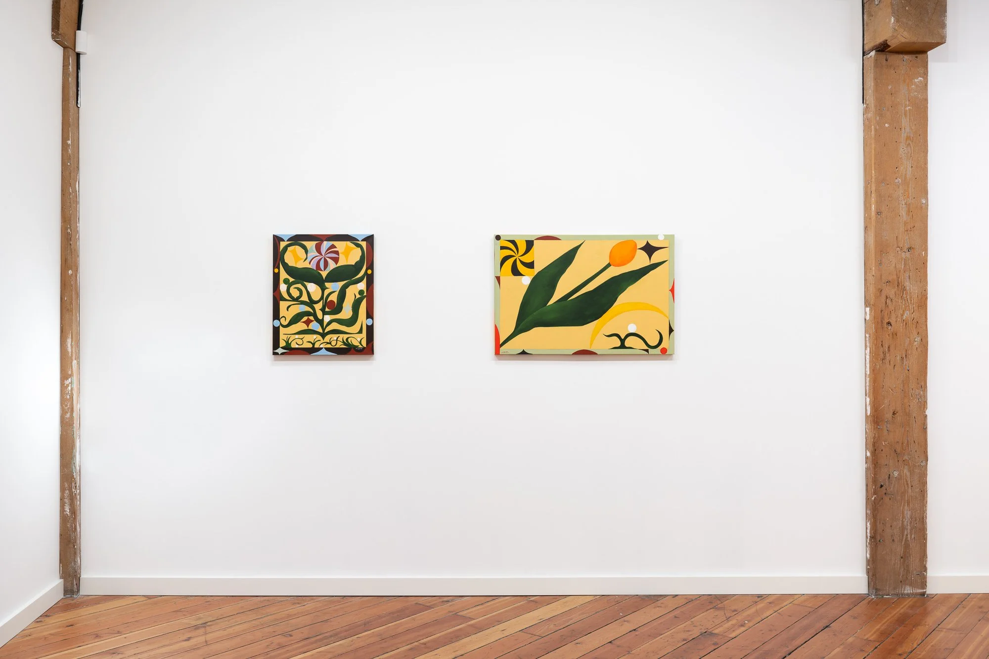 With this new series, Ackerman further refines their unique approach with vignette-like compositions that contemplative reflection on the things around them, moving into a slightly darker palette than before. Continuing to draw visual inspiration from vintage design motifs and quilt-like patterns, Love Notes from the Lurker presents canvases of long-tendriled plants growing wildly and spiraling freely under the cover of the night sky and the stars that fill it.