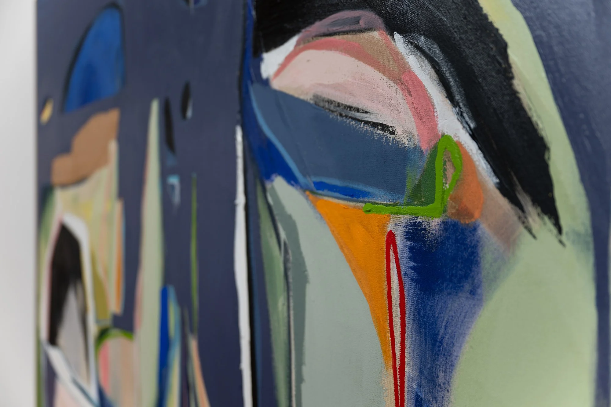 Vitale’s paintings explore the complexity of the human experience through a visual language of organic forms, lines, planes, and rich color fields. Each work unfolds as an isolated experiment, a meditation on texture, space, and emotion, where the dialogue between mark and erasure becomes central. His process is meticulous and intuitive; after weeks of unresolved exploration, a subtle shift, a single mark, the removal of one, a minute adjustment in color or contour, can suddenly complete a piece.