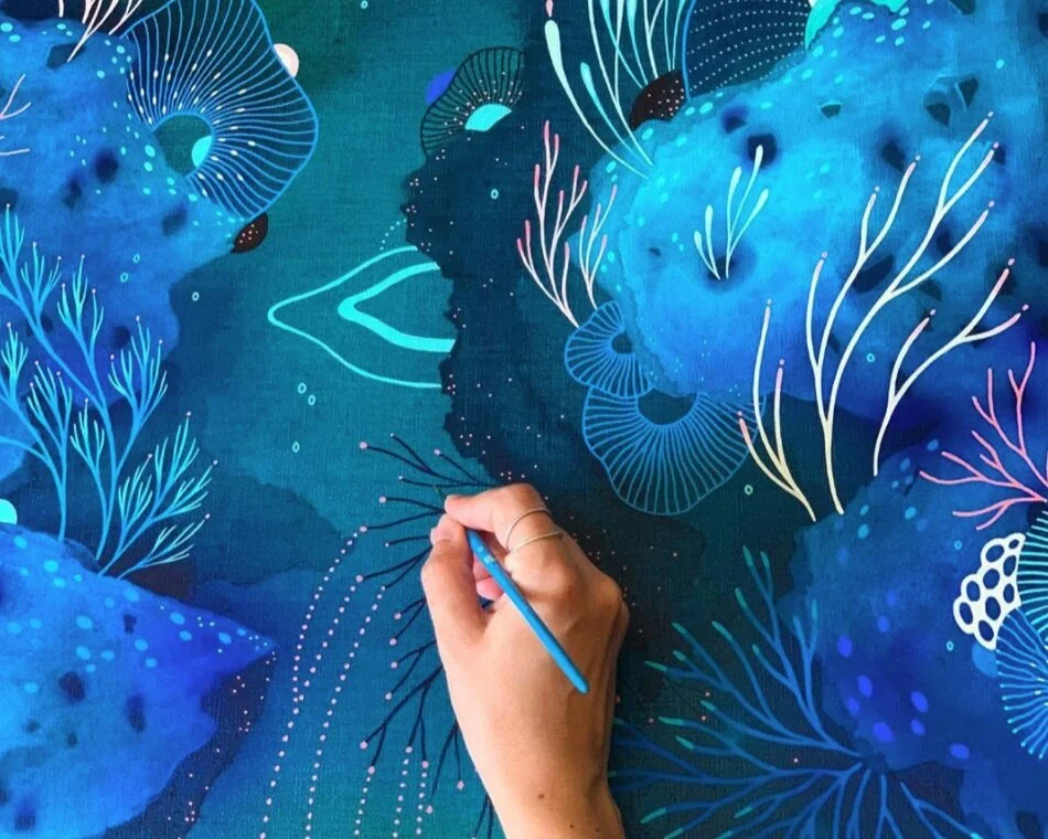 With her latest work, James develops new interactions within self-sufficient environments to create a flourishing utopian space and one where everything exists in perfect harmony and balance. She's been using Prussian Blue ink for years and recently discovered that this particular color is used as an antidote for certain kinds of toxic metal poisoning. Apparently, the Prussian Blue particles sequester the negative toxic metal particles and thereby speed up their expulsion from one's system. She purposefully incorporated this color into every piece so as to turn the work itself into a similar kind of antidote.