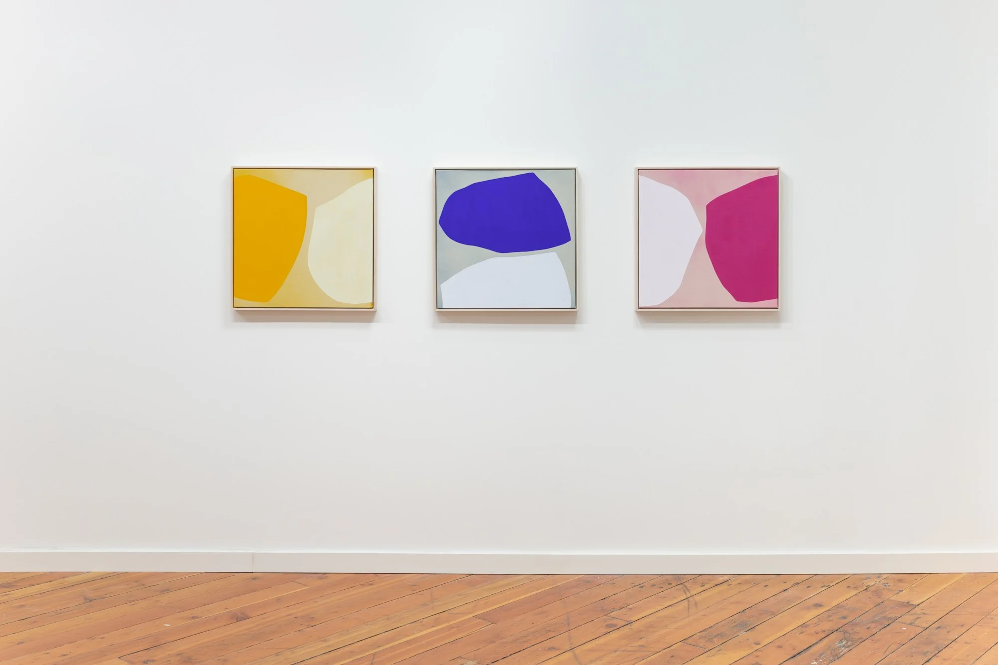 Creatures of Light follows Mia Farrington’s longstanding, meticulous exploration of the relationship between form and color. Her new work expands her oeuvre of bold, hard-edged geometric abstraction by incorporating raw linen and cotton canvases. Inspired by the prismatic colors of natural light and their impact on our existence, Farrington creates calming, meditative arrangements by juxtaposing shapes. Stoic onyx forms and vivid hues engage in elegant dialogues atop rustic, textured linen and ink-stained cotton. Farrington isolates and magnifies specific color variants found in natural settings, inviting viewers to resonate with indefinable emotions, relying on our personal associations to imbue the work with meaning. While her paintings initially appear as pitch-perfect compositions from a distance, closer inspection reveals subtle imperfections— the painter’s hand, irregularities in the linen— echoing the flawed beauty inherent in our relationships with ourselves and others.